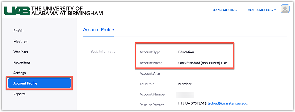 There are two main accounts at UAB: UAB Standard (Non-HIPAA) and UAB HIPAA. Users can log into their Zoom account in a web browser and click Account Profile at the far left, then look and see the type and name of the account they are under.