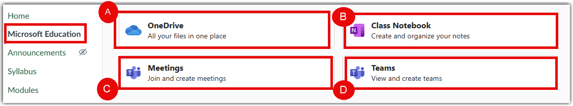- Microsoft Education (A) will now be a gateway to multiple tools. To access OneDrive files, click on the large OneDrive (A) located on the dashboard. Once logged in, your OneDrive folder library will be available inside Canvas. You can view OneDrive documents, submit assignments, or start collaborations from this page and other locations in the course. To learn more about OneDrive visit the OneDrive page. Class Notebook (B) can be accessed just by selecting the Class Notebook (B) on the Microsoft Education dashboard. Meetings (C) allows you to create, record and share virtual class meetings. Teams (D) is a link to the Teams group for the course. To learn more about these features, visit the Microsoft Teams page.