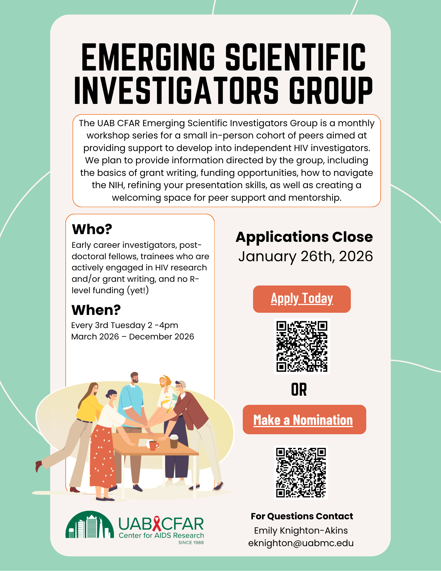 The Developmental Core launched the Emerge peer-mentoring program in 2023 to support Early-Stage and New HIV Investigators (ESI/NHI) - including both MDs and PhDs - across UAB. Participants are drawn competitively from the Schools of Public Health, Nursing, and Medicine. Each annual cohort includes approximately 12 members who participate in monthly, in-person sessions facilitated by Drs. Ronnie “Matt” Gravett and Angela Wahl.