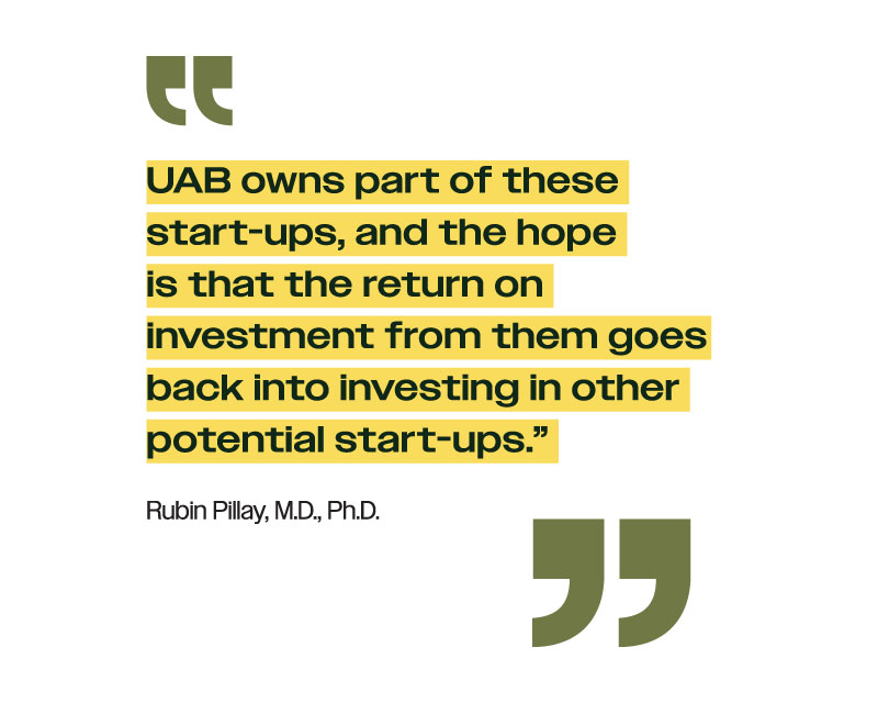 Academic medical centers (AMCs) are among the United States’ most active hives of biomedical innovation thanks to their often robust research enterprises. Increasingly, AMCs like the Heersink School of Medicine play a central role in another realm of innovation: the biomedical/biotech start-up space. According to Rubin Pillay, M.D., Ph.D., executive director of the UAB Marnix E. Heersink Institute for Biomedical Innovation, assistant dean for Global Health Innovation in the Heersink School of Medicine, and chief innovation officer for UAB Health System, a start-up is a new business entity created to commercialize intellectual property. The Heersink Institute for Biomedical Innovation is a primary player in getting start-ups based on biomedical intellectual property developed within UAB off the ground. “You can be a faculty member, a researcher, a staff member—if you have an idea with commercial potential, our institute provides the support to set up a commercially viable entity to take your idea to the market,” Pillay said.