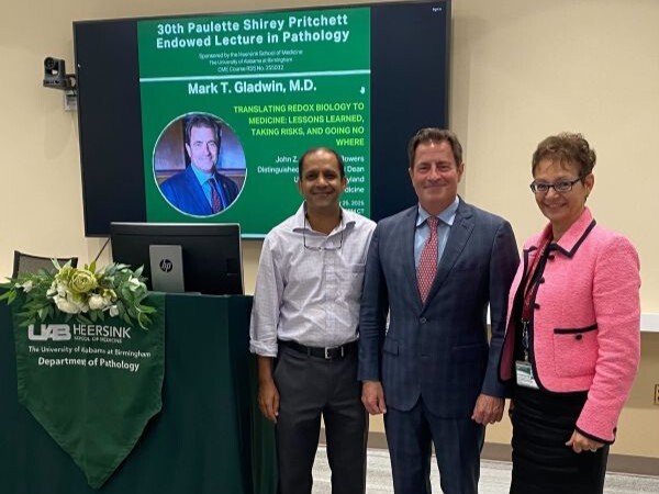 The UAB Department of Pathology celebrated the 30th year of its Paulette Shirey Pritchett Endowed Lecture in Pathology on September 25 with an outstanding lecture by Mark T. Gladwin, M.D., Dean, University of Maryland School of Medicine, Vice President for Medical Affairs, University of Maryland, and the John Z. Akiko K. Bowers Distinguished Professor and Dean. Gladwin delivered the talk, titled, “Translating Redox Biology to Medicine: Lessons Learned, Taking Risks, and Going NO Where.”