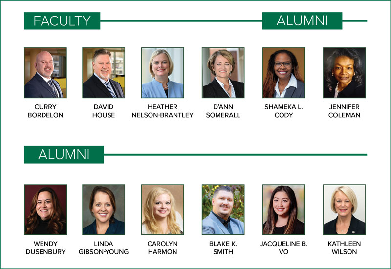 The UAB School of Nursing alumni inductees include Shameka L. Cody, PhD, AGNP-C, PMHNP-BC (MSN 2011, PhD 2017); Jennifer Coleman, PhD, RN, CNE, COI, ANEF (BSN 1976); Wendy Dusenbury, PhD, DNP, AGACNP-BC, FNP-BC, ANVP-BC (DNP 2014); Linda Gibson-Young, PhD, APRN, FNP-BC, CNE, AE-C, FAANP (MSN 2003, PhD 2011); Carolyn Harmon, PhD, DNP, RN, NI-BC (DNP 2014); Blake K. Smith, MSN, RN, FADLN (MSN 2017); Jacqueline B. Vo, PhD, RN, MPH (BSN 2014, PhD 2018); and Kathleen Wilson, PhD, APRN, CPNP, FNP-BC, BC-ADM, FAANP, FNAP (MSN 1980, PhD 1992).