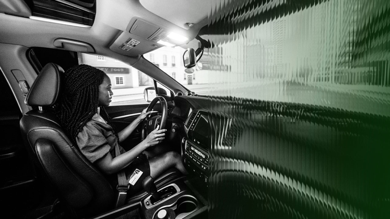 The centerpiece is a 2016 Honda Pilot SUV, complete in every way except for its engine and wheels, which have been removed. It rests on a hydraulic platform and is surrounded by a semicircular wall of digital screens stretching from floor to ceiling. Computers and simulation software are hooked up to the vehicle’s steering wheel, accelerator pedal, brakes, rearview mirror and side mirrors. Hit the gas and the vehicle rocks back on its gimbals, pushing you into your seat and mimicking the acceleration effects of a real car. Stomp on the brakes and you are jolted forward. Pass oncoming traffic on the big screen in front of you and it immediately shows up in the rearview mirror. Overtaking cars that start out in the rearview mirror seamlessly appear in the side mirrors and finally pass by out the windshield. Eye-tracking cameras capture where the driver is looking at all times.